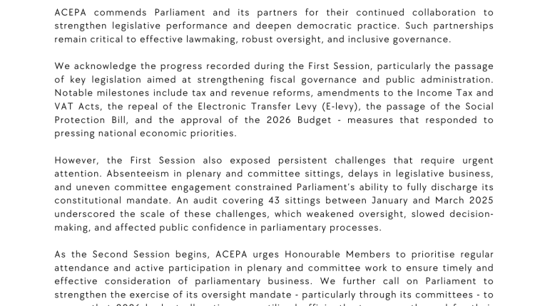 By Freeman Dagadu, Project Officer, ACEPA Introduction The first session of Ghana’s 9th Parliament convened at a time of strained public trust and high expectations for parliamentary relevance. Economic recovery pressures, environmental concerns, and growing demands for accountability placed Parliament at the centre of Ghana’s democratic and development discourse. Beyond[…]