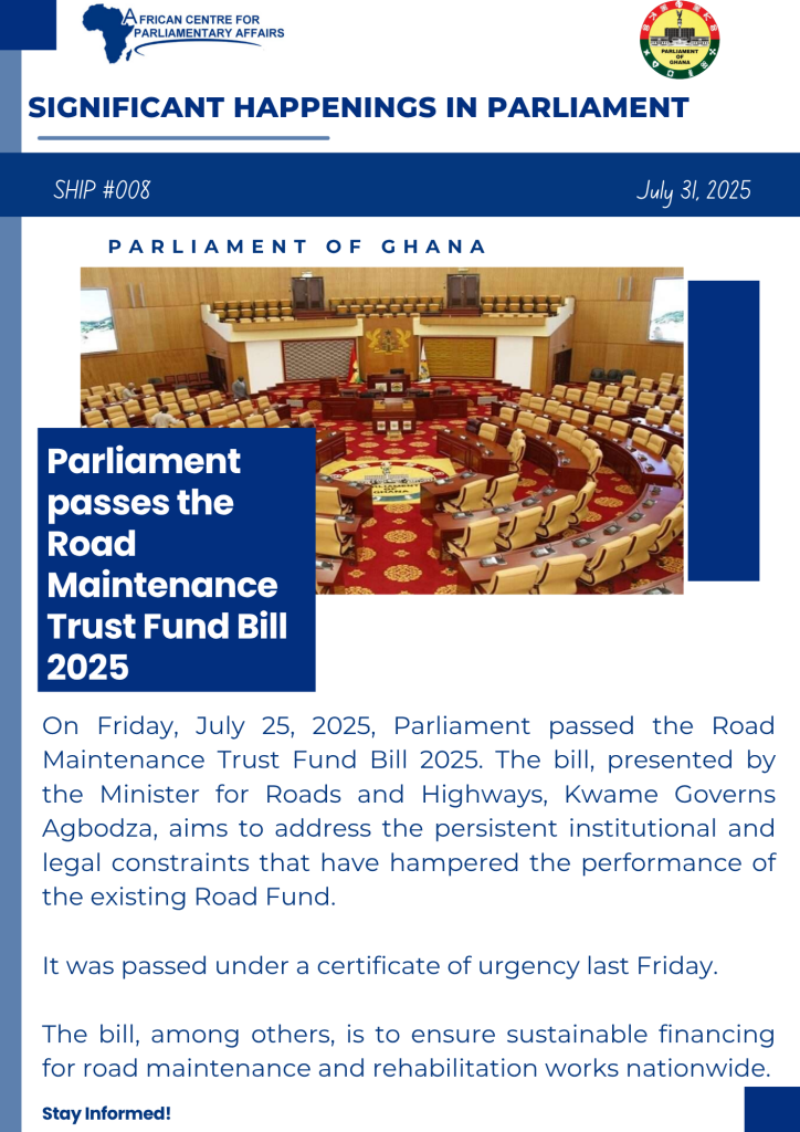 On Friday, July 25, 2025, Parliament passed the Road Maintenance Trust Fund Bill 2025. The bill, presented by the Minister for Roads and Highways, Kwame Governs Agbodza, aims to address the persistent institutional and legal constraints that have hampered the performance of the existing Road Fund.